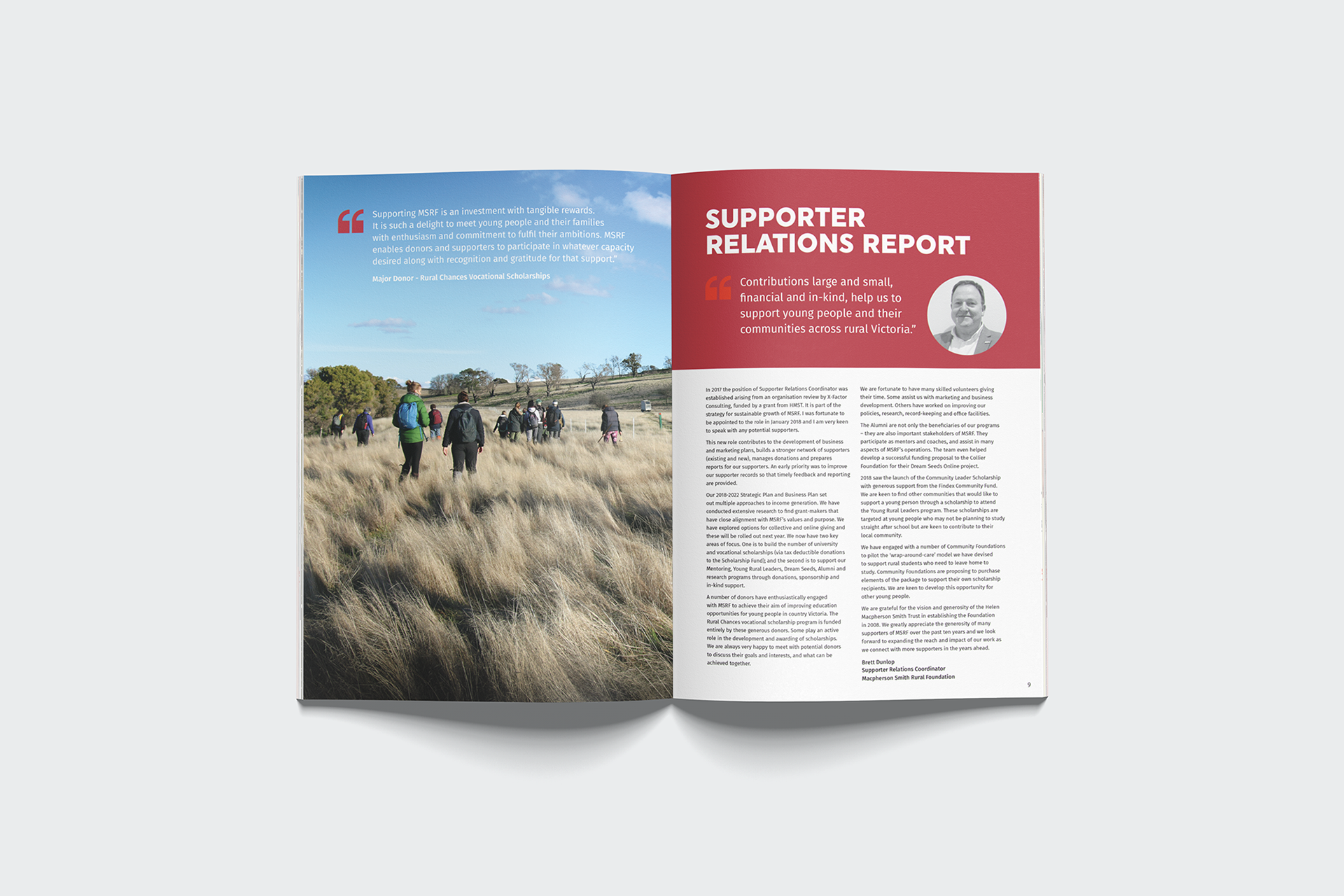 Annual Report design and print for the Macpherson Smith Rural Foundation.